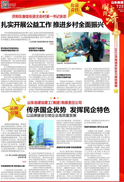 硬實力讓城市強大,軟實力讓城市偉大。3月20日下午,2023濟南城市軟實力榜樣頒獎盛典在山東大廈舉行。山東建工集團獲評2023濟南城市軟實力榜樣之“品牌引領榜樣”,企業先進事跡在《山東商報》上刊登。濟南市委宣傳部副部長、市文明辦主任孫世會;濟南市委宣傳部部務會成員王慶會;濟南市委政法委副書記,市法學會黨組書記、常務副會長卜海晶;濟南市中級人民法院副院長李會德;濟南市住房和城鄉建設局黨組副書記、副局長安紀文;濟南市民營經濟發展局黨組成員、副局長燕軍等領導出席儀式。集團黨委副書記張方明代表集團上臺領獎,工會主席、黨群部部長欒兆偉參加活動。